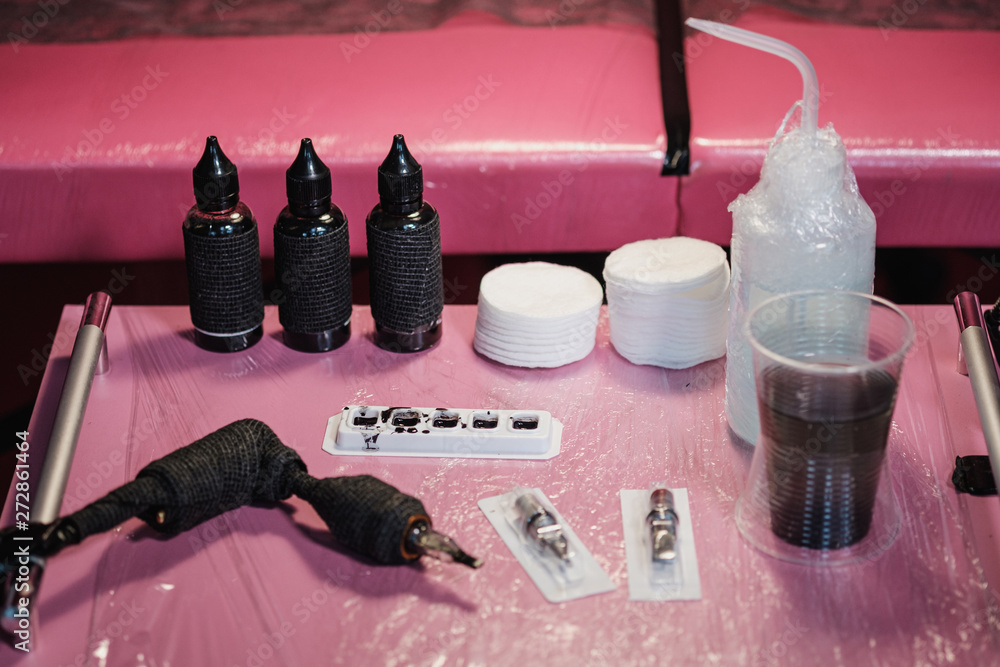 Close Up Of Tattoo Master Tools Needles Inks Petroleum Jelly And Disinfectant Liquid On A Pink And White Background Concept Tattoo Studio Stock Photo Picture And Royalty Free Image Image 127569091